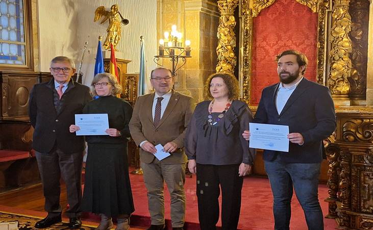 Amoedo e Sánchez-Carreira, que foron premiados polo artigo ‘Os efectos iniciais da COVID-19 nas desigualdades de renda en Galicia e a súa distribución na sociedade’, publicado na Revista Galega de Economía, recibiron hoxe, no salón de graos do reitorado, o premio, acto que contou coa participación do presidente do CES Galicia, Manuel Pérez Álvarez e co reitor da USC, Antonio López Díaz, así como coa directora do IDEGA, María dolores Riveiro García.